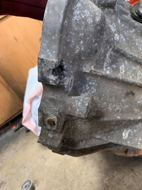 Here's the broken part of the case - not too terrible. This is where the bracket for the rear mount bolts up. I extracted the broken bolt successfully but the broken part needs work.